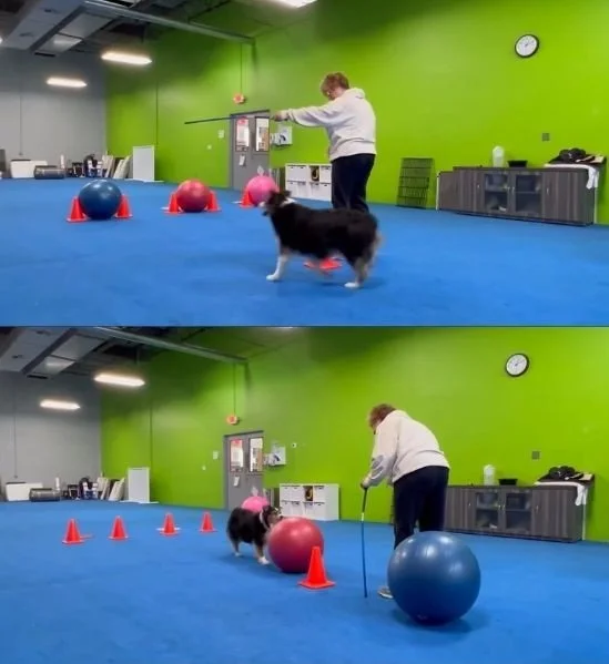 Treibball is a sport that requires your dog to work away from you, follow direction to a ball, center to a specific ball, wait and then push the selected ball to you while you wait at a goal.